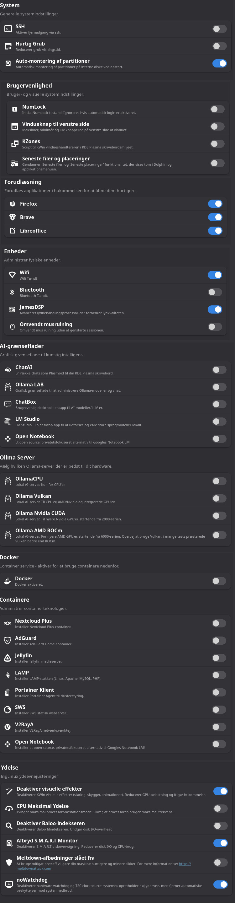 Jeg har nu brugt den siden decmber 2024, først i Virtualbox, og de sidste 5 måneder på rigtig hardware. Prøv den i Virtualbox, eller KVM. Du vil bliver overrasket, og den er 100% oversat til dansk. Den kan hentes her: https://iso.biglinux.com.br/
